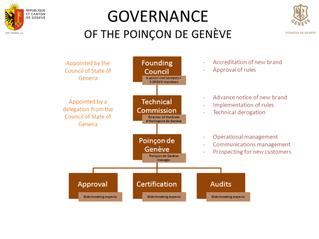 The supreme entity authorised by the Geneva Council of State is the Foundation Council of the Geneva Laboratory of Horology and Microengineering. It is the legal body and only guarantor of the Poinçon de Genève.